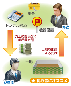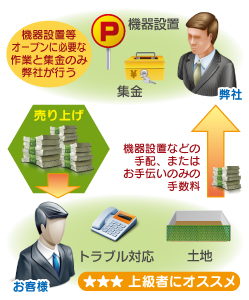 また、このプランの特徴はお客様は土地を用意していただくだけで、機器設置やオープンしてからの集金管理やトラブル(※1)の対応、毎月の運営は弊社で全て行います。
